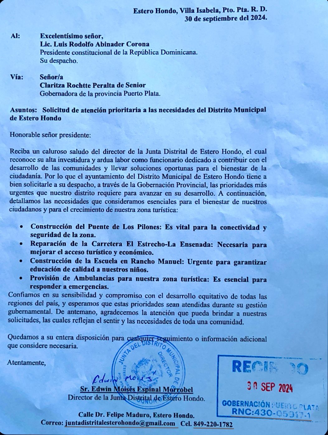El pasado 30 de septiembre, el director de la Junta Distrital de Estero Hondo, Edwin Moisés Espinal Morrobel, envió una carta dirigida al presidente constitucional de la República Dominicana, Luis Rodolfo Abinader Corona, a través de la Gobernación Provincial de Puerto Plata. En la misiva, se detalla una serie de necesidades prioritarias para el desarrollo de la comunidad y su zona turística.