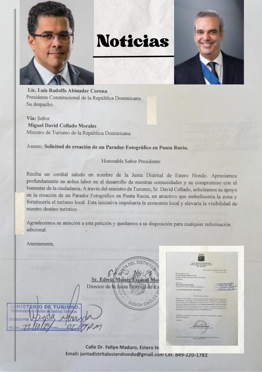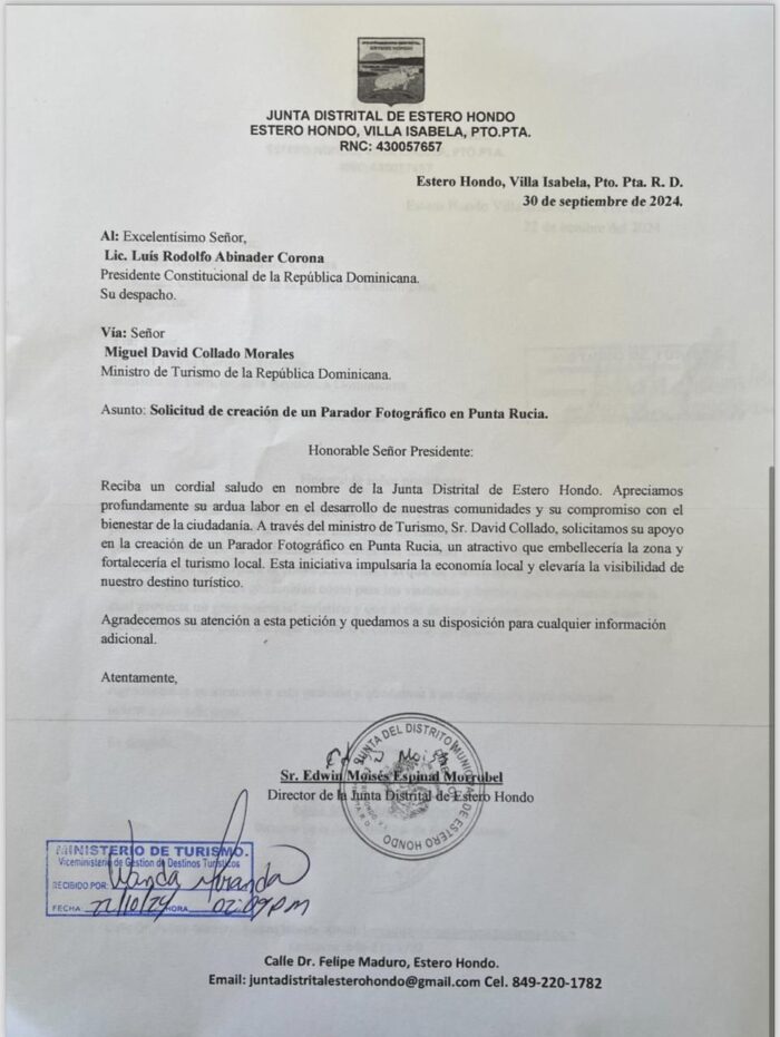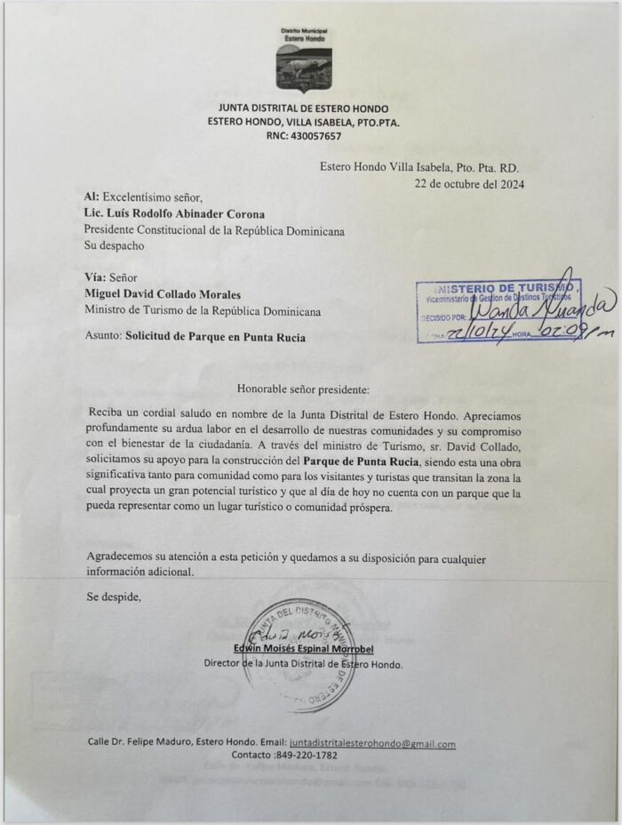 La Junta Distrital de Estero Hondo ha enviado dos peticiones formales al presidente de la República Dominicana, Lic. Luís Rodolfo Abinader Corona, y al ministro de Turismo, Miguel David Collado Morales, con el propósito de impulsar el turismo en la zona de Punta Rucia.