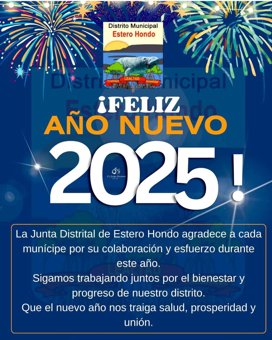 La Junta Distrital de Estero Hondo extiende un cálido saludo de Año Nuevo a todos los munícipes, agradeciendo profundamente su colaboración y esfuerzo durante el año 2024.
