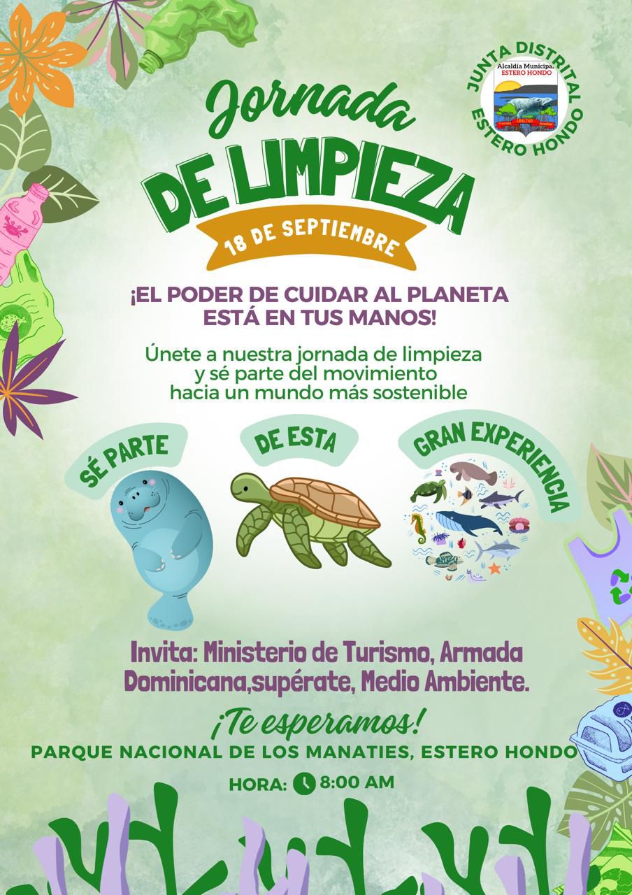 El miércoles 18 de septiembre a las 8:00 a.m. se llevará a cabo una jornada de limpieza en el Parque Nacional de los Manatíes. Esta actividad es organizada e impulsada por el Ministerio de Turismo, la Armada Dominicana, el programa Supérate, el Ministerio de Medio Ambiente, la Junta Distrital de Estero Hondo y la regidora Marys Luz Fermín. Es una excelente oportunidad para contribuir a la preservación de este importante espacio natural. ¡Te esperamos!