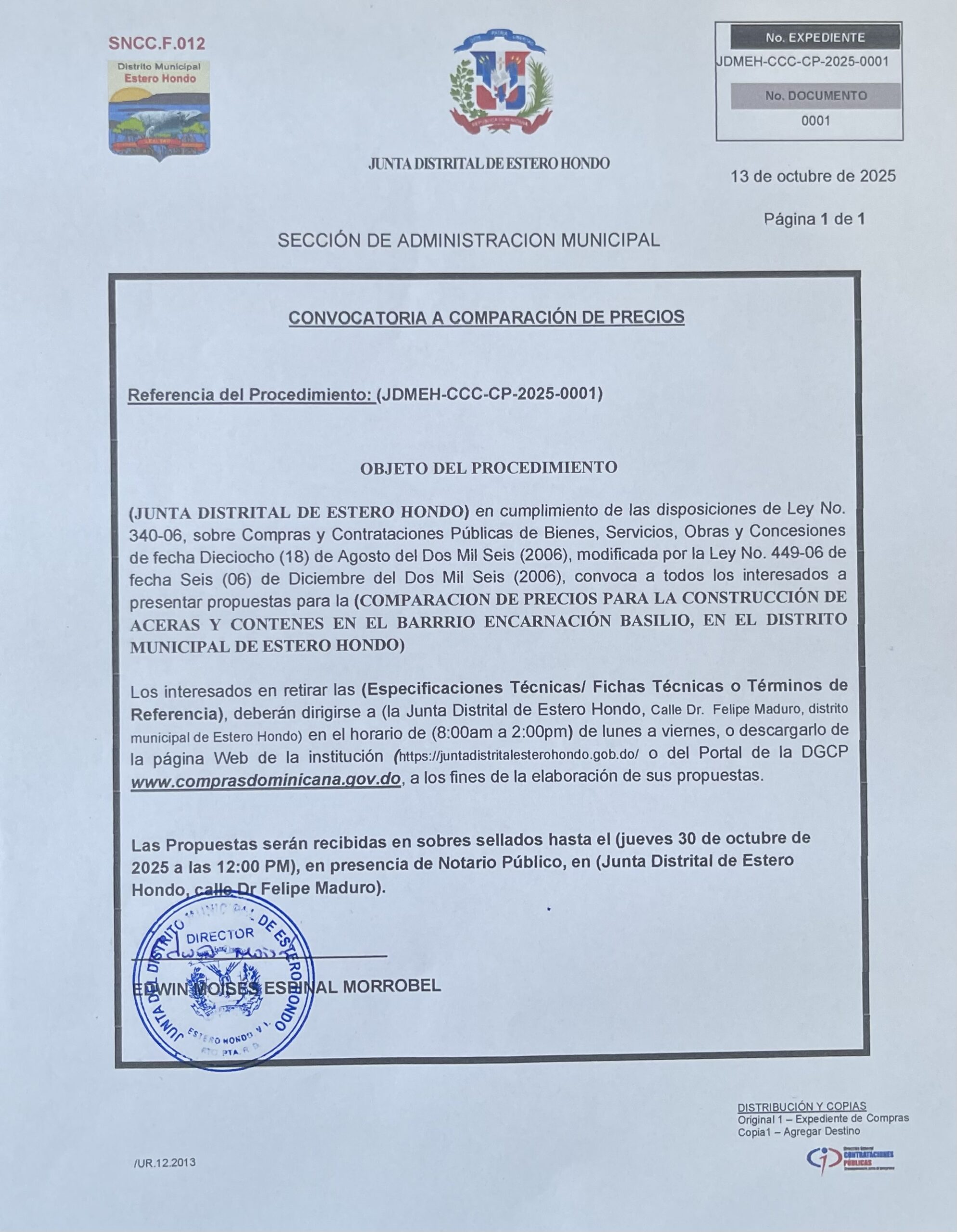 La Junta Distrital de Estero Hondo informa que está abierta la Convocatoria a Comparación de Precios para la construcción de aceras y contenes en el barrio Encarnación Basilio.