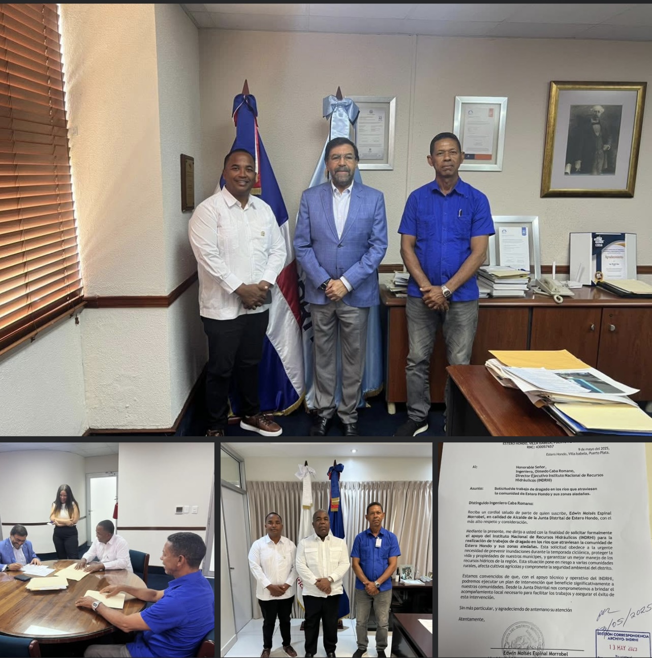 El día de ayer realizamos una importante visita a la ciudad de Santo Domingo, acompañados por el presidente del Partido Revolucionario Moderno (PRM) en nuestro distrito, el Sr. David Acevedo Peña. Durante esta jornada, entregamos de manera formal la solicitud del dragado de los ríos de nuestro distrito al Director Ejecutivo del Instituto Nacional de Recursos Hidráulicos (INDRHI), Ing. Olmedo Caba Romano, quien acogió positivamente nuestra petición y nos ofreció su respaldo para llevar a cabo esta importante intervención.